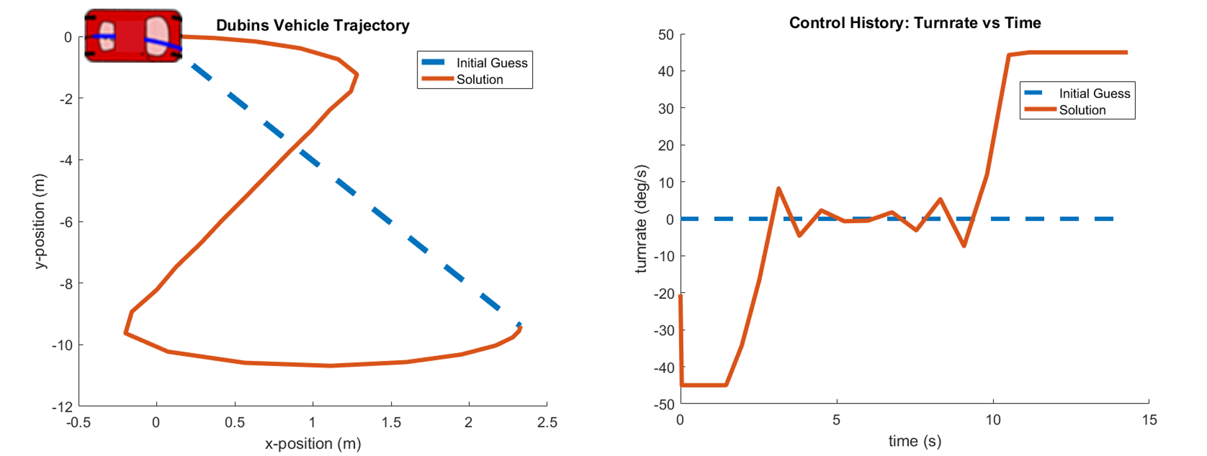 If we solve the optimization problem using the abovementioned algorithm (discretization and SQP), we will get a trajectory of the dubin vehicle position(x, y, t) and control inputs (t).