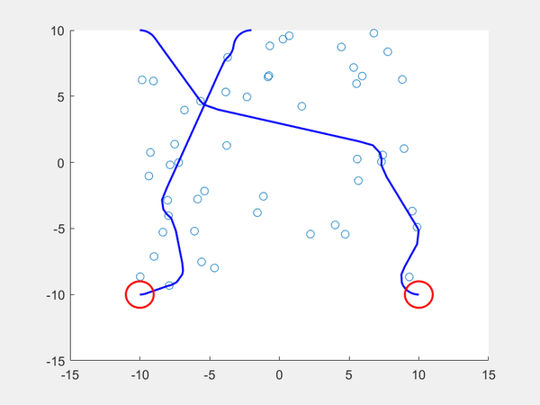 If we want two dubin vehicles to maneuver around the environment with the sampled states, we can add another reachability constraint such that each robot should choose a path that minimizes the likeliness of two paths colliding. After setting a starting point and ending point for each robot, we then obtain the closest reachable set for each and if they are the same, each robot takes a different set, They do this ahead of time because all states are observable (the robots donβt have to make real-time decisions because all states are already sampled). If no other states exist for one robot, the robot that has an alternative path can take the sampled state so that the robot with no other states can move to its only reachable set. The result can be seen below.
