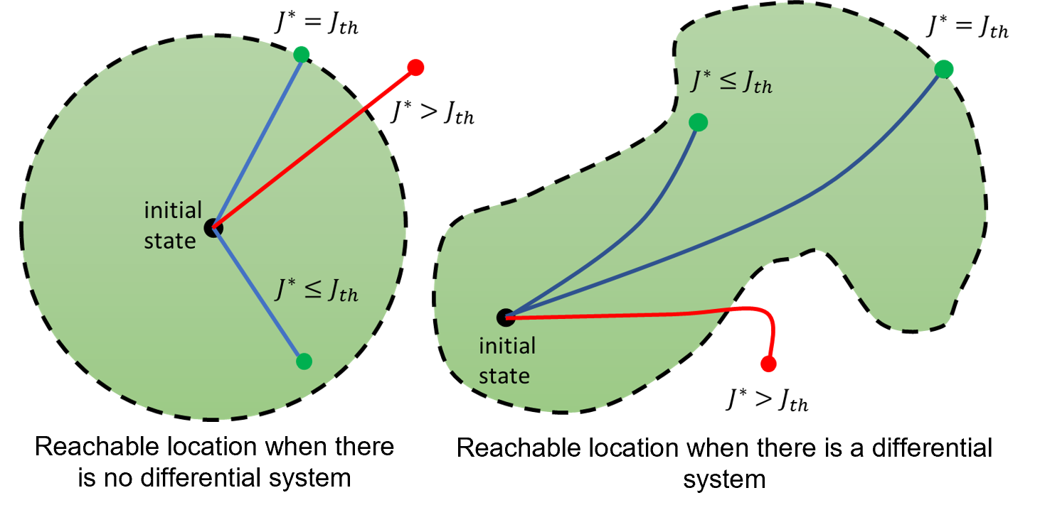 The answer is no. From experience, we have seen that even the strongest robots cannot instantaneously change velocities, and driving and flying robots cannot move sideways. This is because robots such as this dubin vehicle are kinematically and dynamically constrained in their motions. In automatic control theory research, there is a need to find an optimization-based open-loop control law that solves an optimization problem accounting kinodynamic (kinematic + dynamic) constraints. As shown in the image below, unlike the reachable sets where no differential system exists, there will be a different set of locations when there is a differential system.