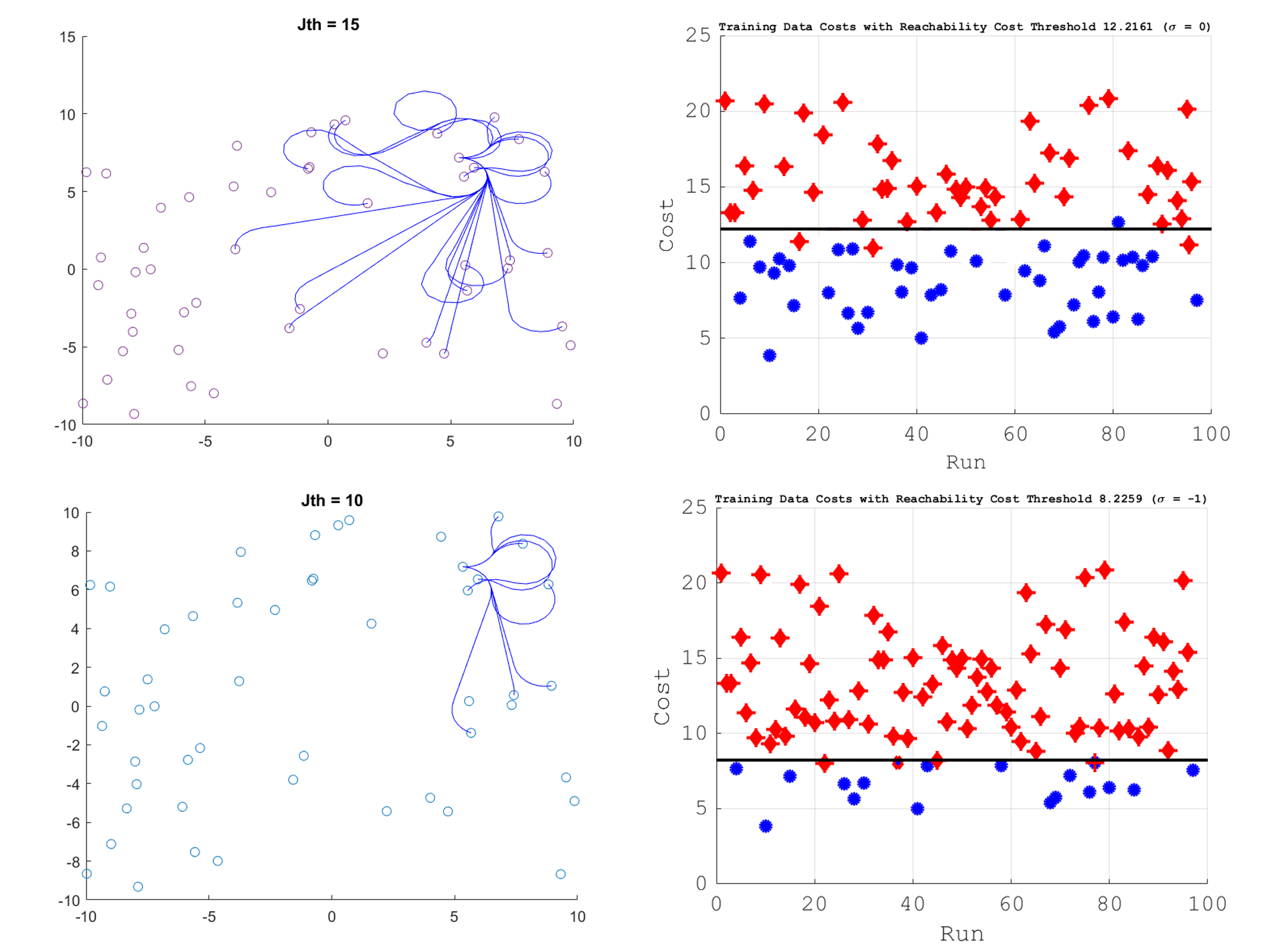 The red dots indicate non-reachable sets and the blue dots indicate reachable sets. As seen in the result, we can see that by lowering the cost threshold, the number of reachable sets decreases. There were some results that were not linearly separable, such that some values were classified as unreachable when it is in fact reachable.